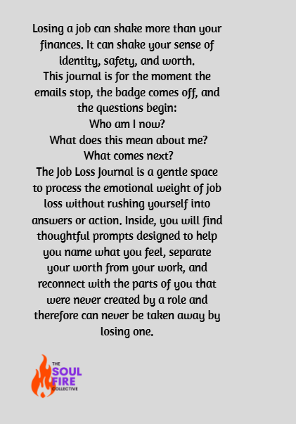 The Job Loss Journal is a gentle, grounding space to process the emotional weight of job loss without rushing yourself into answers or forcing yourself into action before you’re ready. Inside, you’ll find thoughtful prompts designed to help you name what you feel, separate your worth from your work, and reconnect with the parts of you that were never created by a role and therefore can never be taken away by losing one.