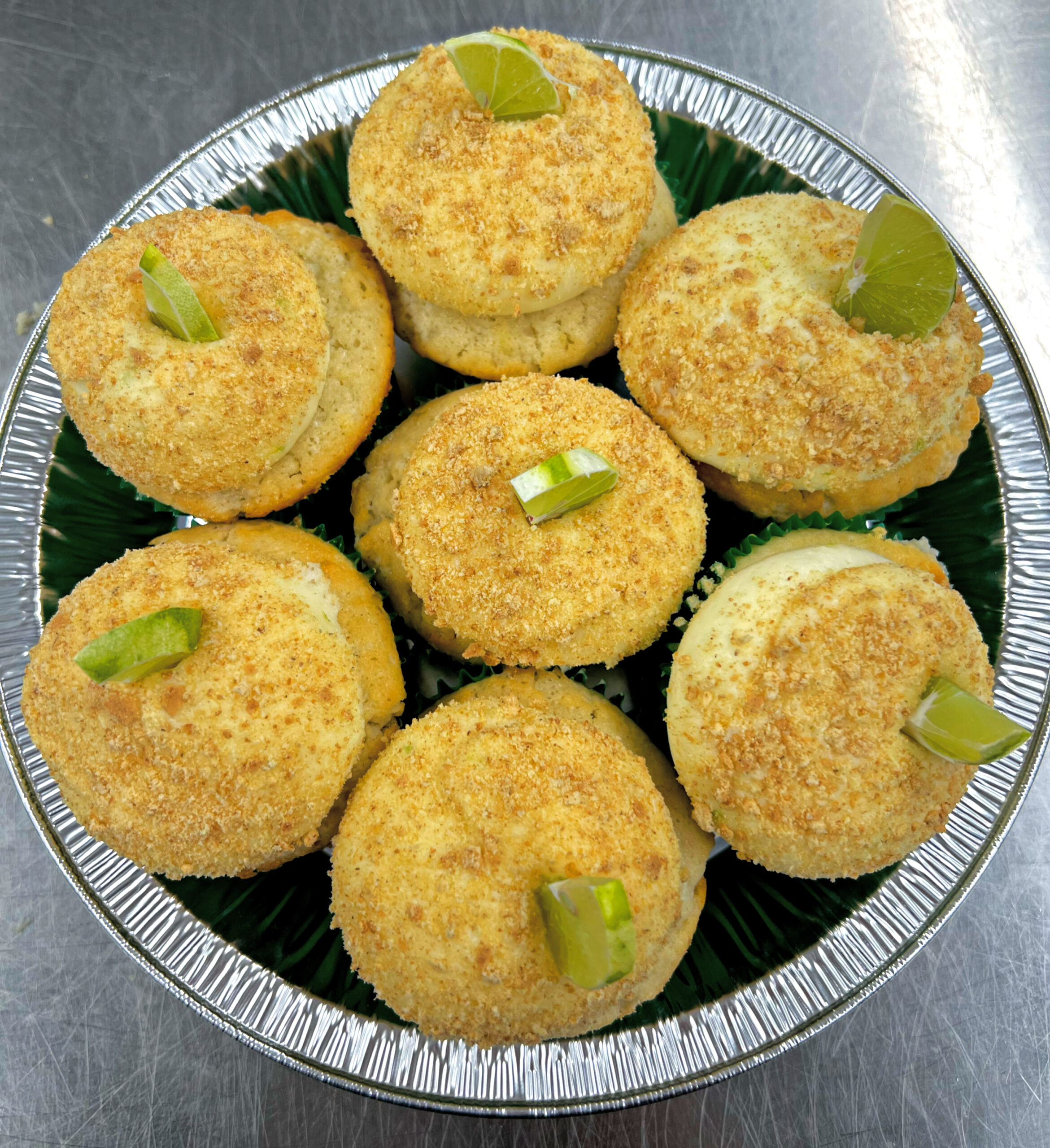 Vanilla cupcakes with key lime frosting dipped into graham cracker crumbs!