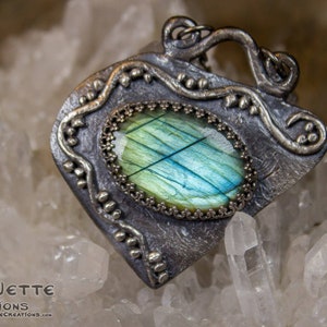 An original design created by Karen, one-of-a-kind .999 fine silver pendant, created from Precious Metal Silver Clay, with a beautiful Labradorite stone set in an ornate silver bezel. All embellishments were hand sculpted. Catch the gorgeous flash of the stone as the pendant moves. The chain is sterling silver and 16 inches long.