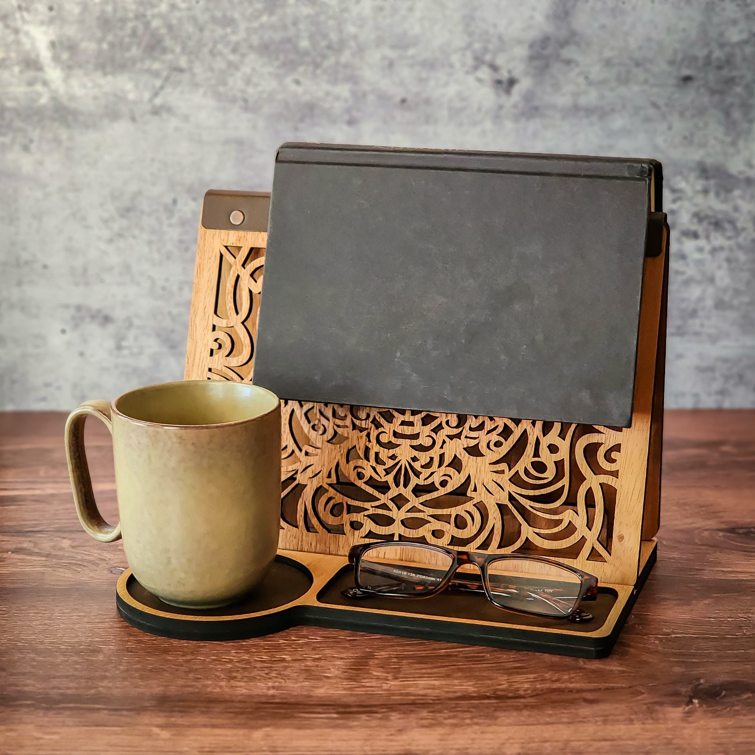 Available in either Mahogany or Red oak and featuring an intricate laser cut pattern this book holder comes complete with cup and eyeglass holders, two openings in back for charging cables and space for your cell phone or small tablet inside. This would make a wonderful gift for any avid book reader!