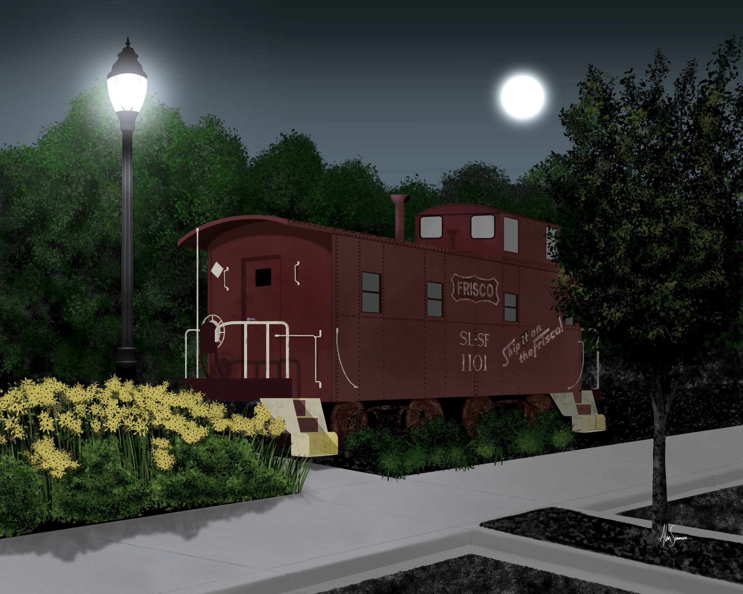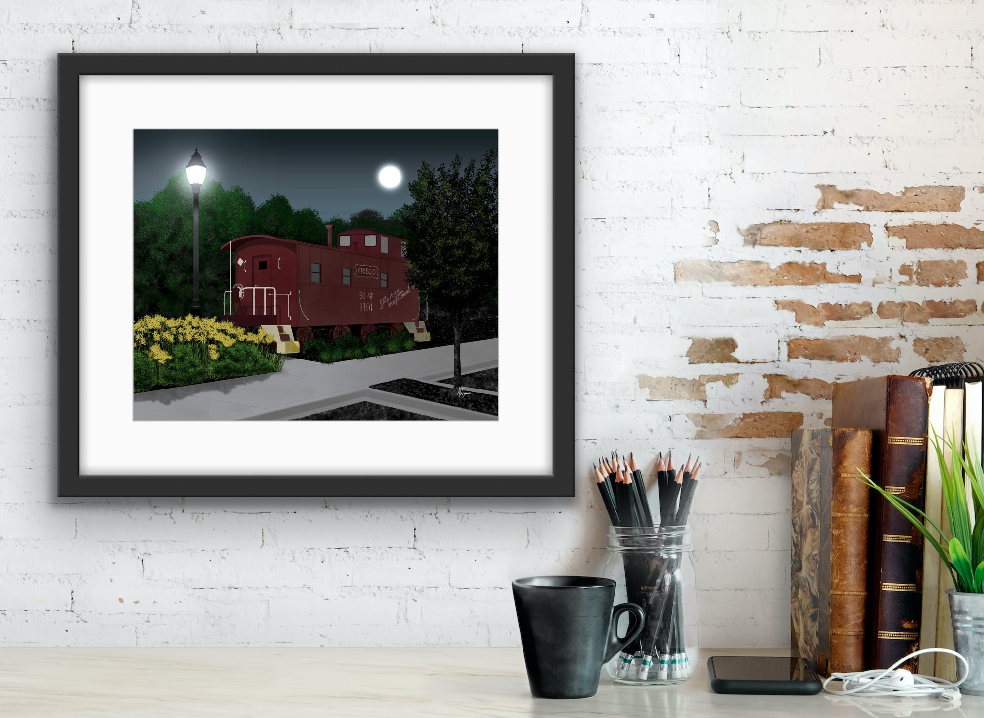 Midnight at the Railyard features the Centennial Caboose, a vintage Frisco train caboose in historic downtown Rogers, Arkansas. The caboose stands stoically in the night, surrounded by beautiful flowers and plants, and illuminated only by a vintage street lamp and the full, bright moon. Hand-drawn digital art. Prints available in 20 x 16, 10 x 8, and 7 x 5.