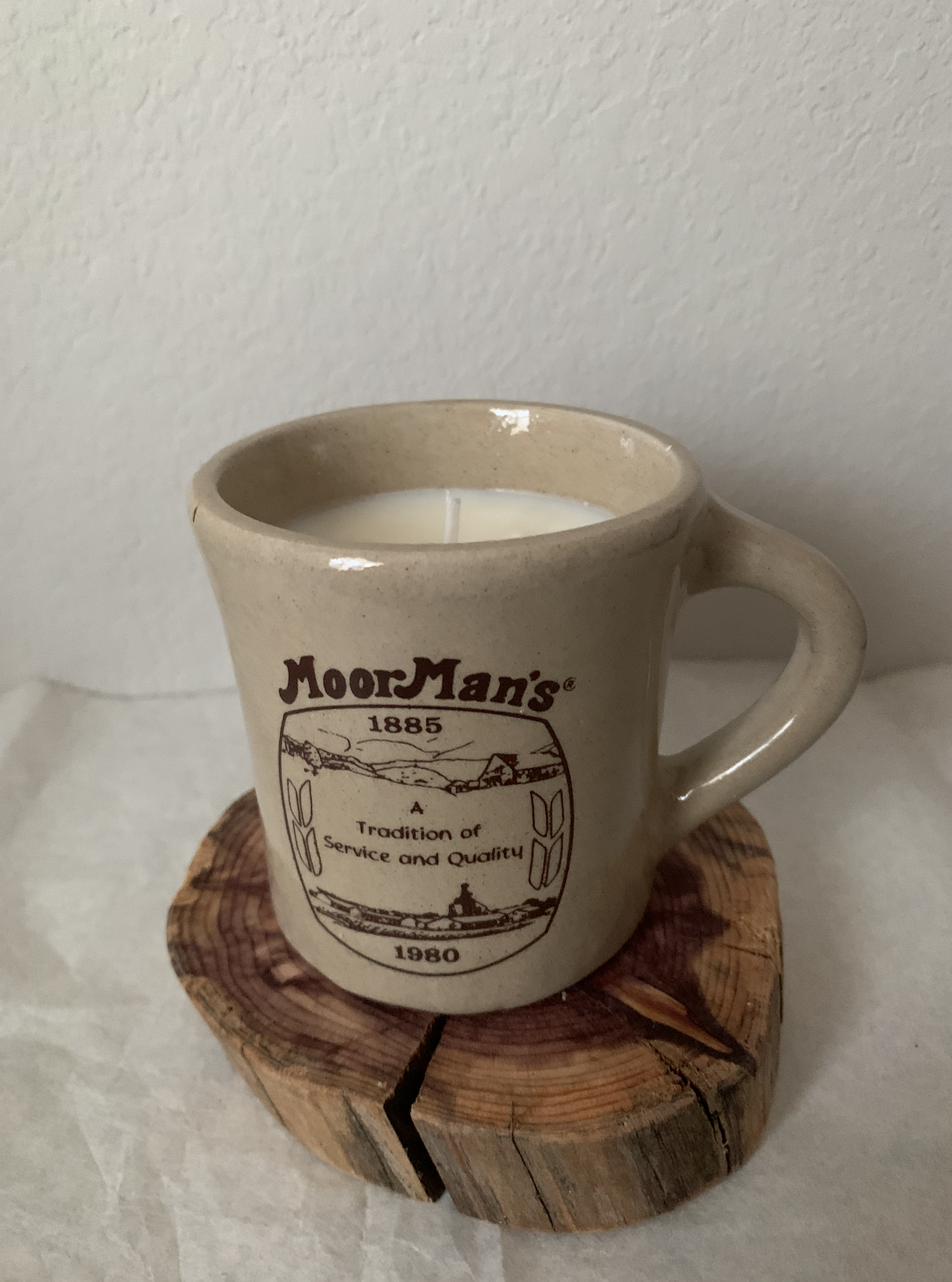 12 oz thrifted brown “Moor Man’s” soy mug candle, scented Vanilla and Hazelnut.