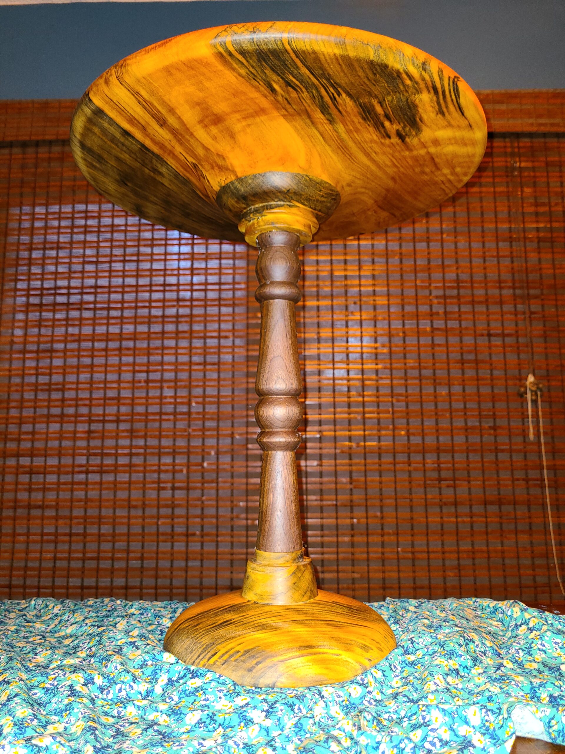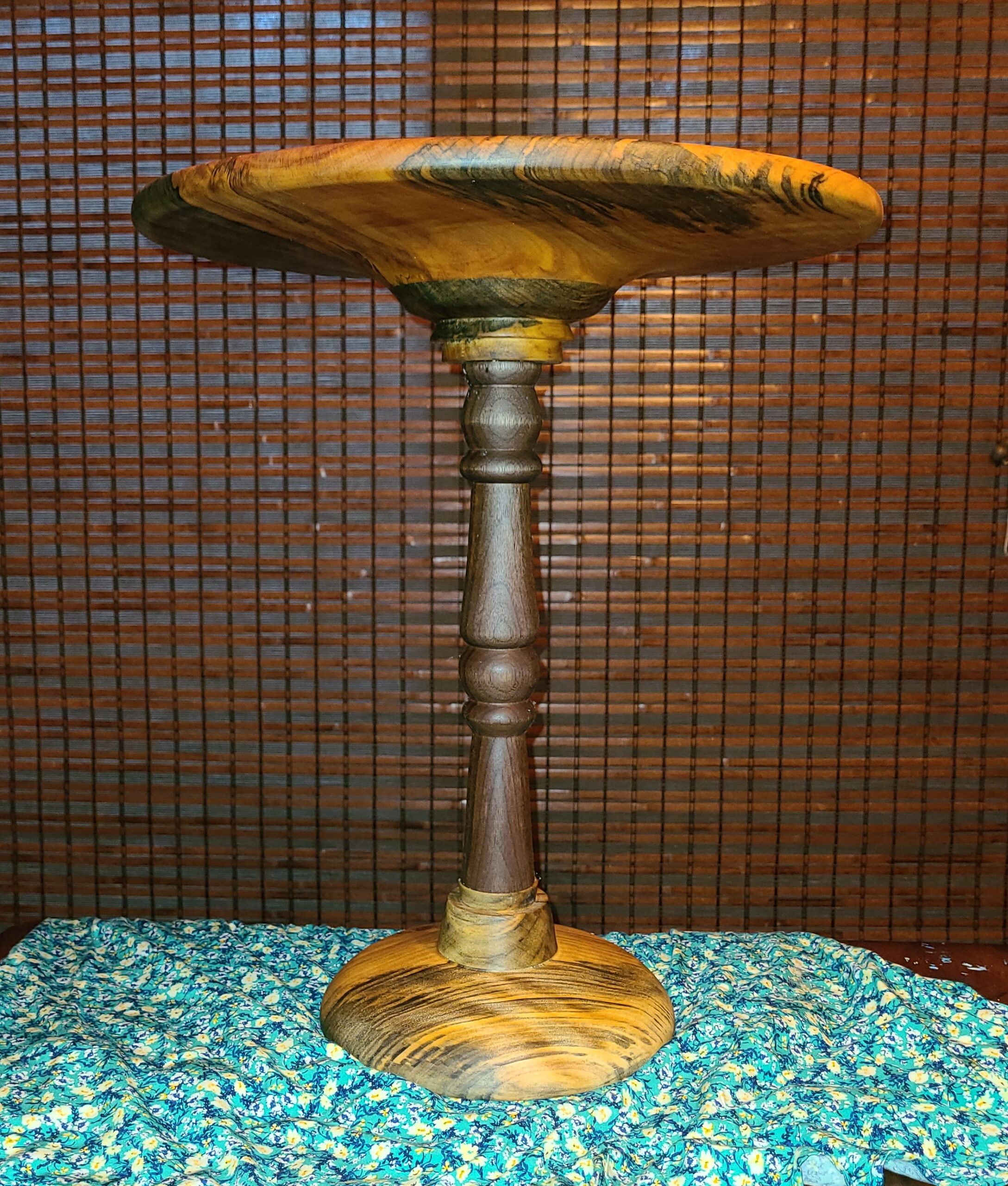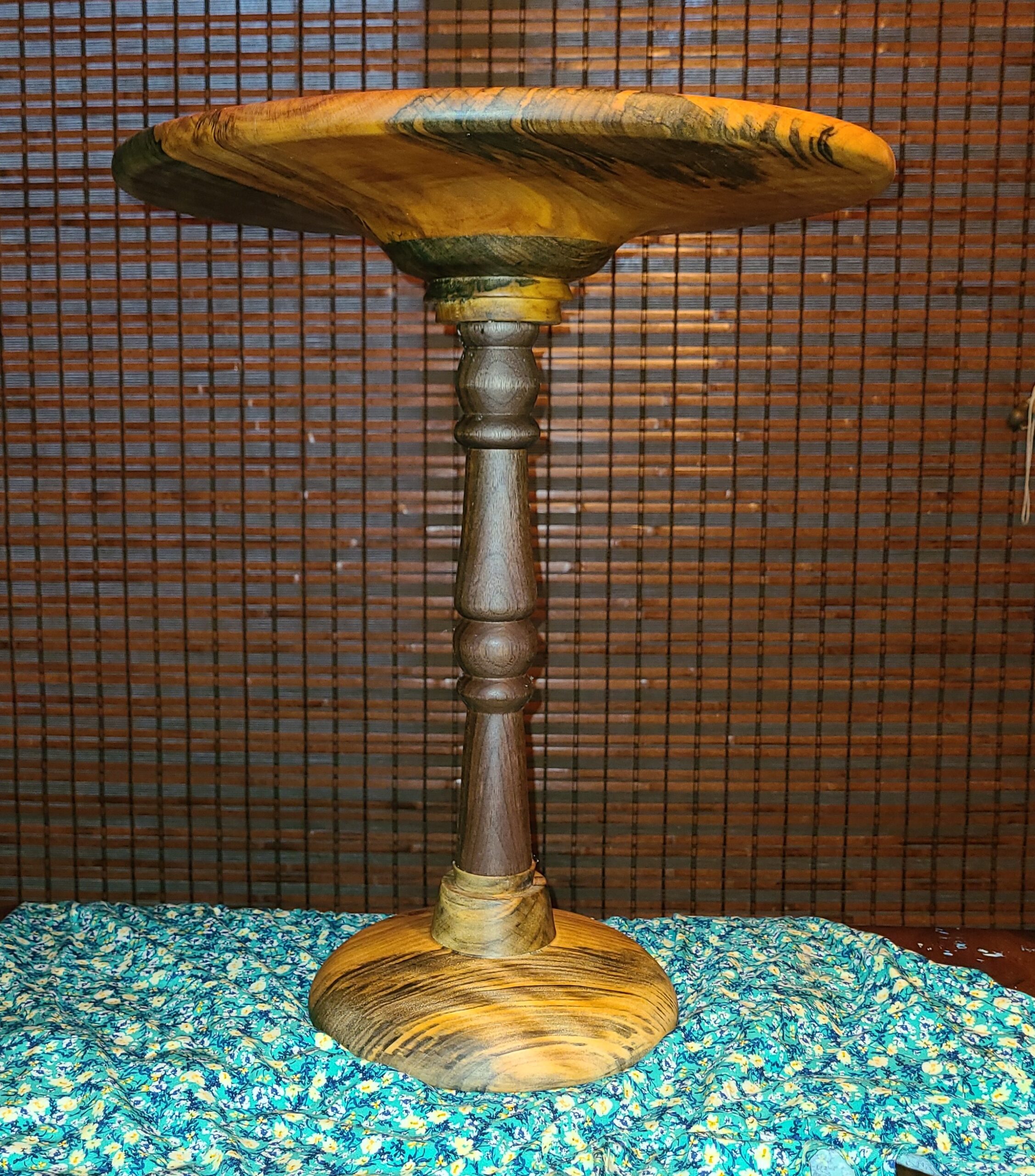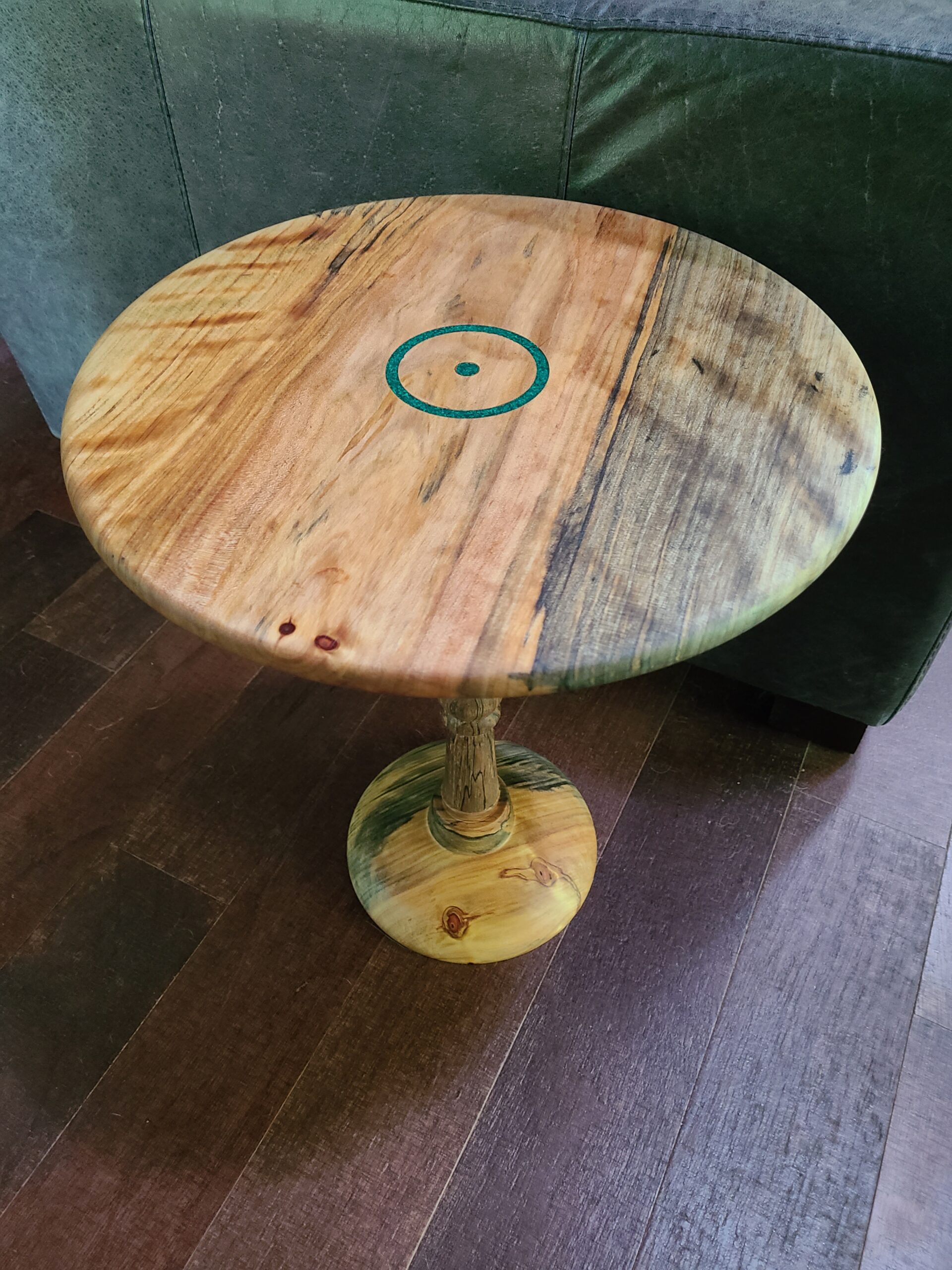 This Norfolk Island Pine and Spalted Walnut Pedestal Table with Stone Malachite Inlay is absolutely stunning in person. The hand turned tabletop is Norfolk Island Pine and features a green Stone Malachite Inlay in the center. It is 15.5 inches in diameter and stands 18.5 inches tall. The hand turned base is also Norfolk Island Pine, and its footprint is only 8 inches, so it can sit almost anywhere. The base and top are connected with a hand turned Spalted Walnut Pedestal and the three are joined using tenons and wood glue, so there is no hardware or assembly required. I hand turned and fitted each piece of this build myself. It will arrive safely packaged and ready for display. Not only is the table refined and stylish, but it is also very sturdy and well balanced. This piece is entirely handmade and there will never be another one just like it. I finished this pedestal table with Hemp Oil and Howards Feed-N-Wax which is a combo of Carnauba wax, Beeswax, and Citrus oil. This creates a beautiful, hand rubbed finish that won’t peel or chip. I recommend applying Howards Feed-N-Wax once or twice a year or your favorite polish. Howards is just a rub in, wait 20 minutes, then hand buff off wax that leaves a nice satin finish and adds protection from stains and water. Before it ships, I will have applied several coats of wax to add depth to the finish, but the piece will still feel like wood. The Hemp Oil will last for several years and can be reapplied without stripping the piece in the future. I believe this hand building, finishing, and care process creates a very unique item that looks like it was built a hundred years ago but will endure for generations. The tabletop will remain protected from water marks, but I recommend using coasters for any hot cups on this or any other furniture. Visit my Esty shop at https://www.etsy.com/shop/IngrainByDesign. You can see me work on my Youtube channel at https://www.youtube.com/channel/UC5uLb7R1E1j3jS6Iu0WEEqQ