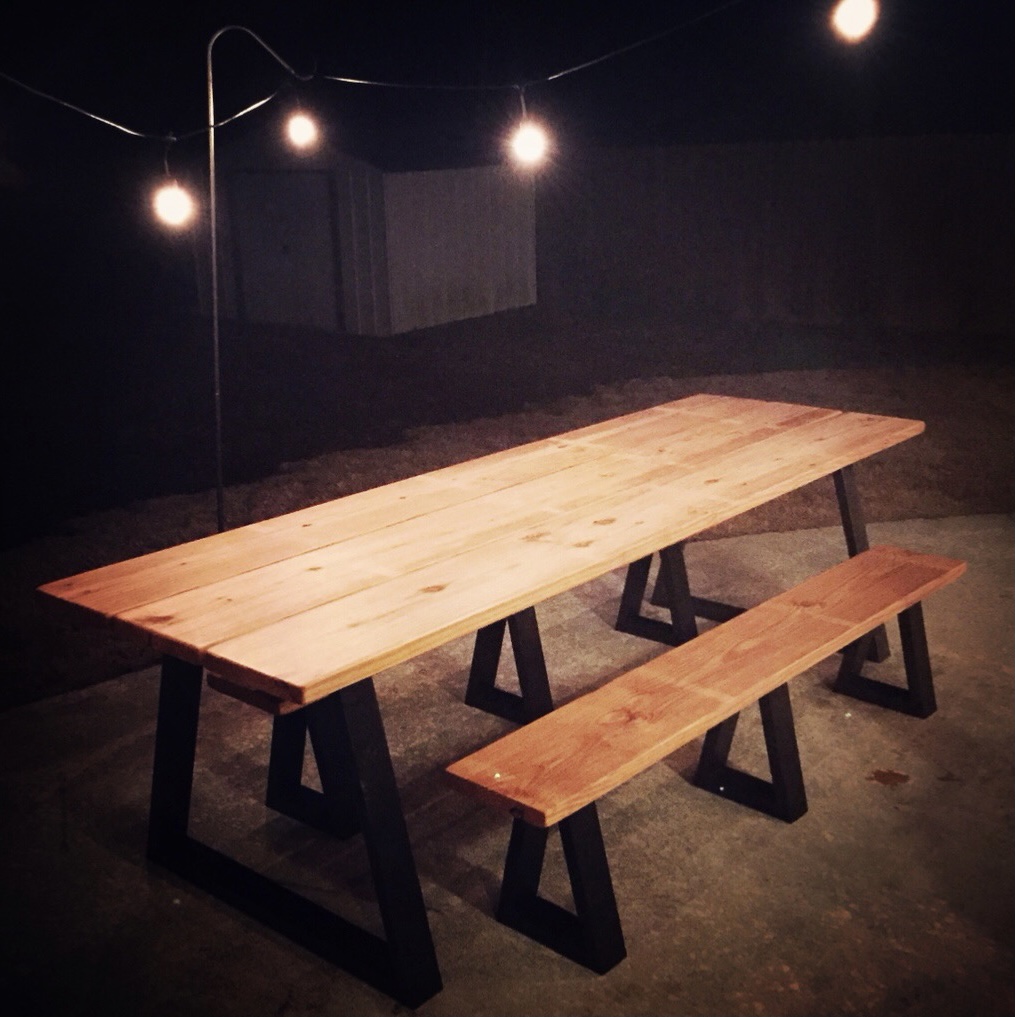 This funky modern outdoor table and bench set is 9ft long, built for the outdoors, and comfortably seats 12!