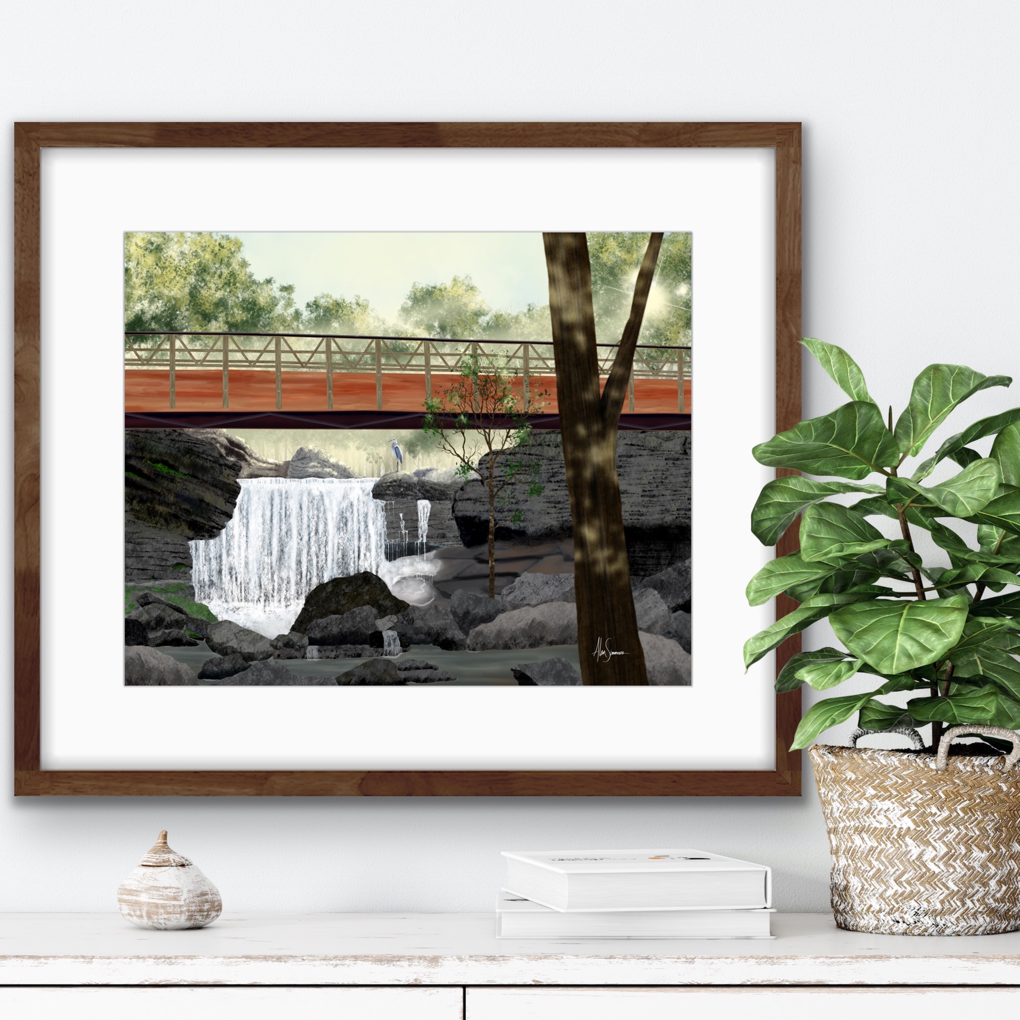 Pinion Creek Falls features an incredible view of the beautiful waterfall at Lake Ann in Bella Vista. Morning sun spills through the trees to highlight the rushing falls and a heron, who is a frequent visitor. Hand-drawn digital art. Prints available in 20 x 16, 10 x 8, and 7 x 5.