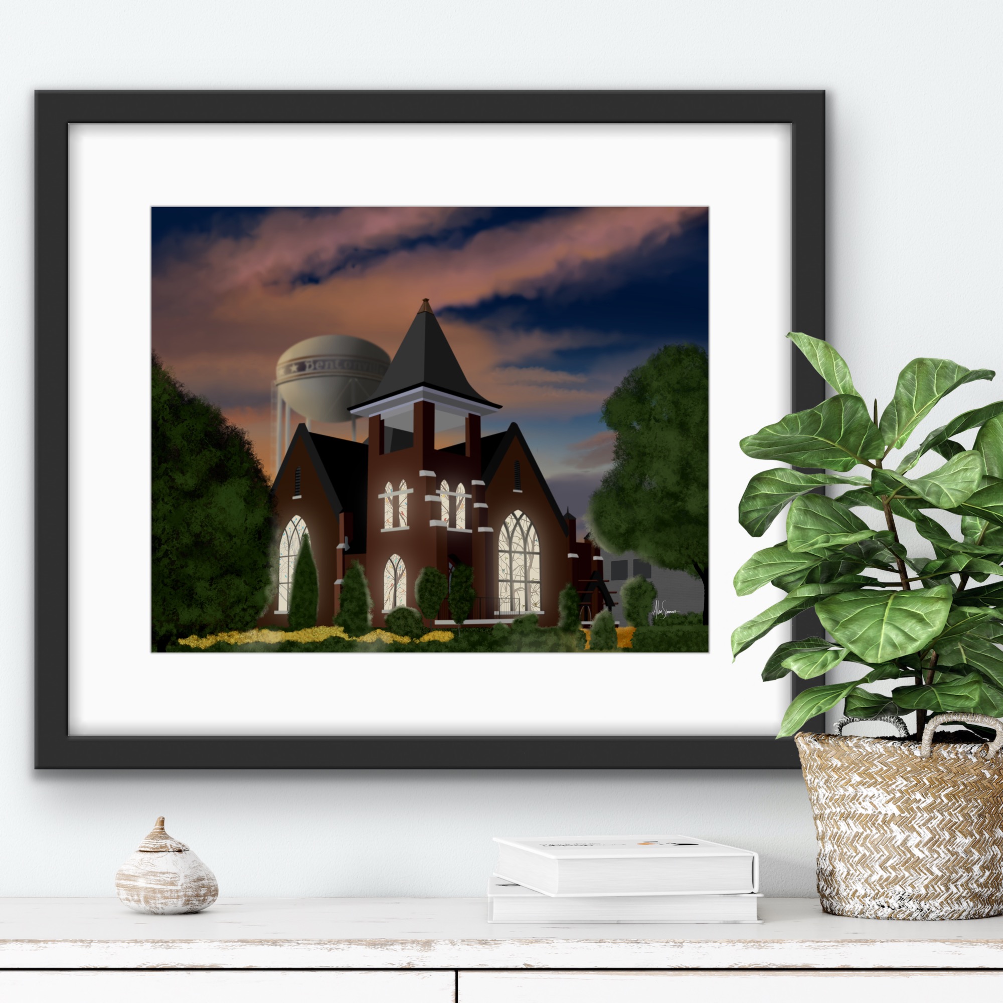 Preacher’s Son is one of five pieces in my Bentonville Sunsets collection. It features the familiar church-turned-restaurant and Bentonville water tower against a dusky sunset. The windows are illuminated from within and feature a rendering of the beautiful birds and branches artwork created by renowned local artist George Dombek. Hand-drawn digital art. Prints available in 20 x 16, 10 x 8, and 7 x 5.
