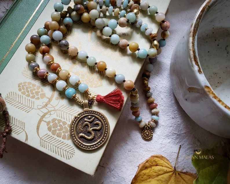 This mala necklace is made of 108 semi-precious gemstone beads: