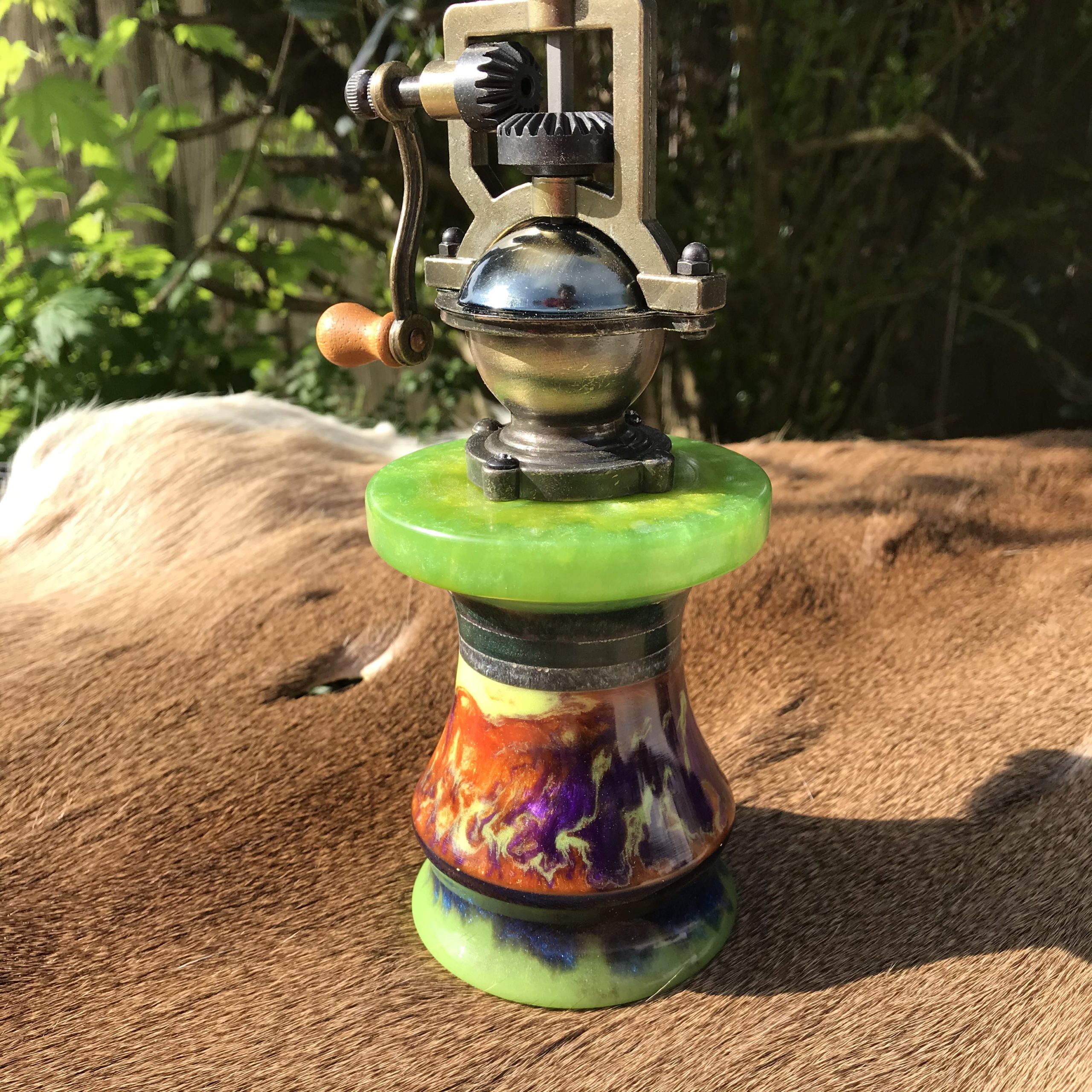 Using my leftover colored-resin-pours, I had a very unique blank to work with. When I got the pepper grinders in I knew this would be perfect for a Steam Punk look.