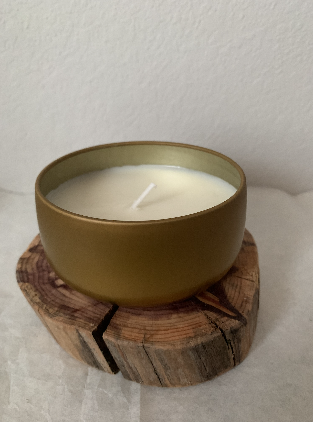 Simple gold 8oz soy candle in recycled jar, scented Vanilla and Hazelnut.