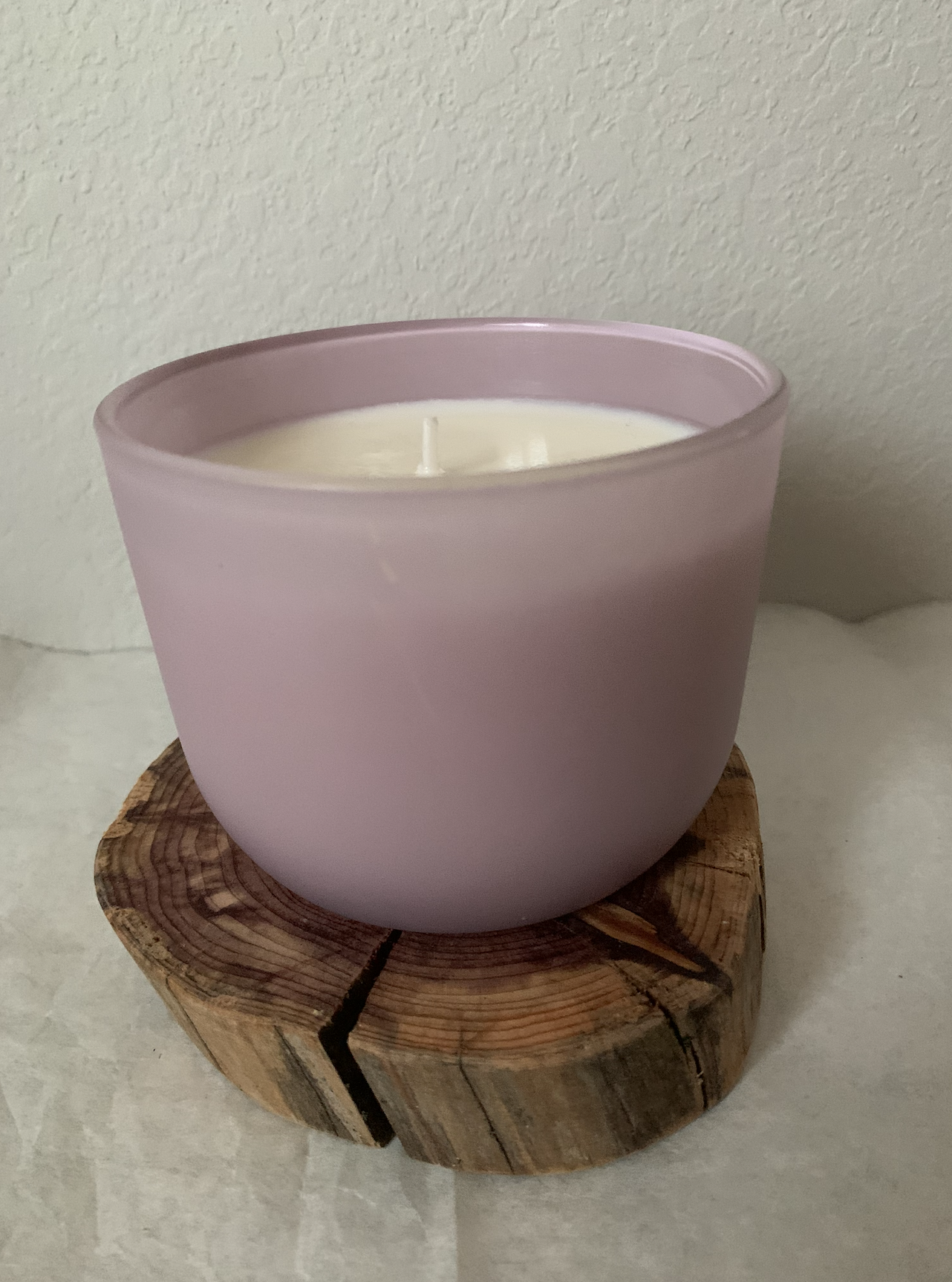 16oz soy candle in light purple up-cycled jar.