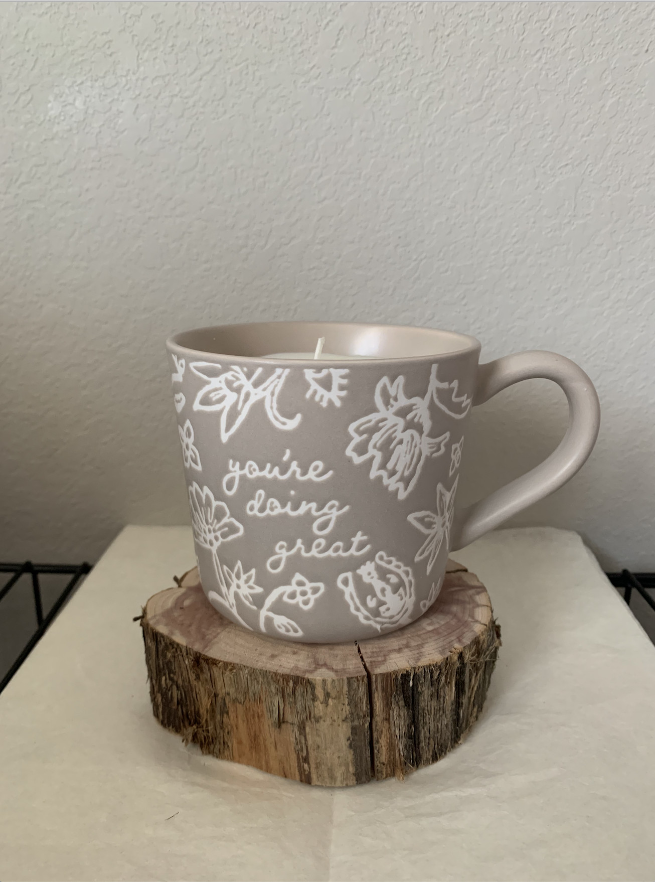 Simple white mug filled with soy wax with hints of Vanilla and Hazelnut. 12 oz mug.