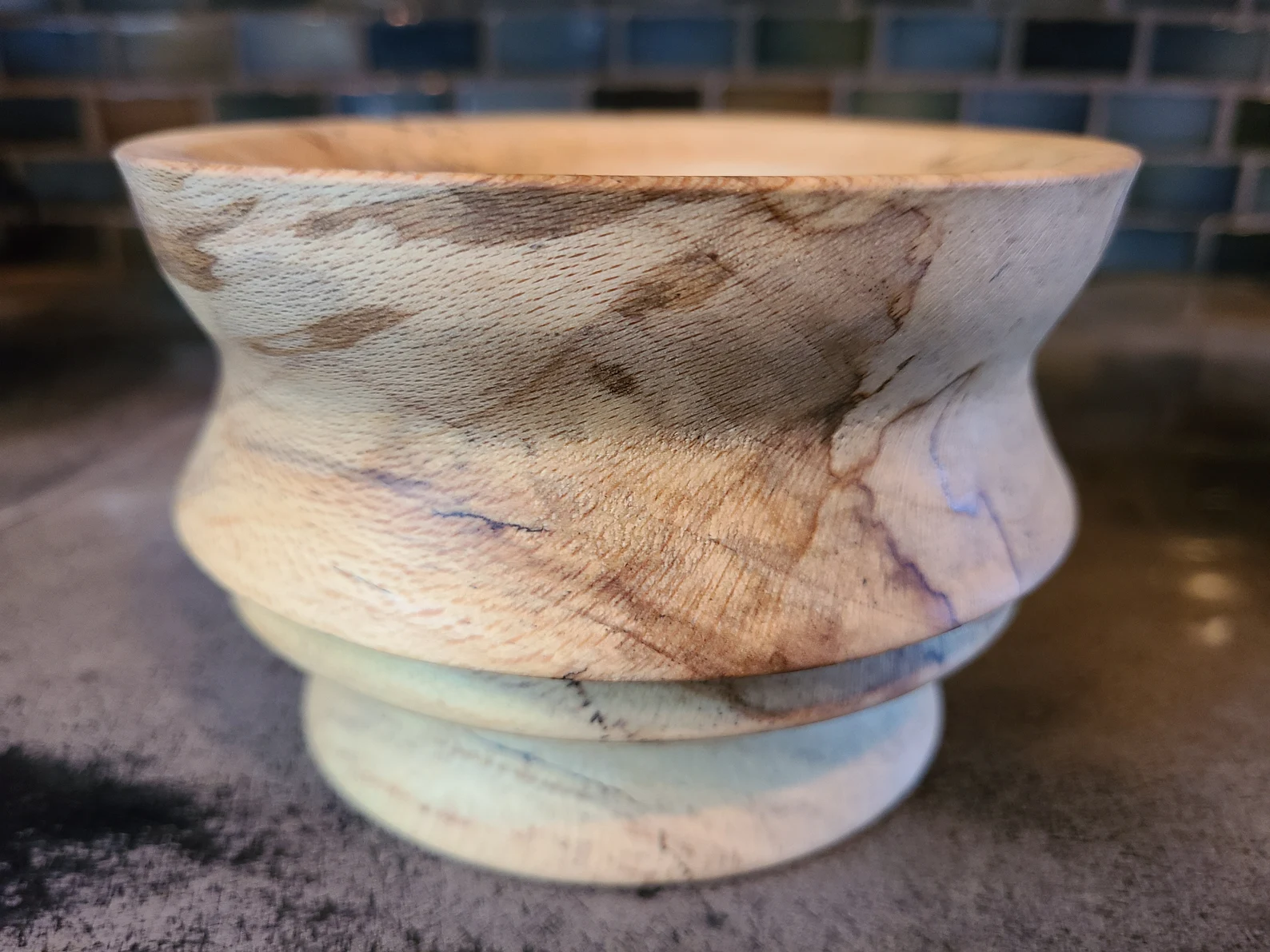 Enjoy this hand turned, Spalted Maple Pedestal bowl. It stands 3.5″ tall, is 5.25″ wide, and 3″ deep. I left the walls thick at over 1/2″, so it would make a nice, durable bowl for candy or nuts. But hey, buy it, and you can put whatever the hell you want in it. This wood bowl is finished with food grade hemp oil and beeswax which makes for a smooth natural finish. Hand wash only. With great joy, I offer you this bowl. Each project begins with a design concept. As I begin to work, it becomes more important to simply follow the wood grain where it takes me. This time the grain led me to your new bowl!