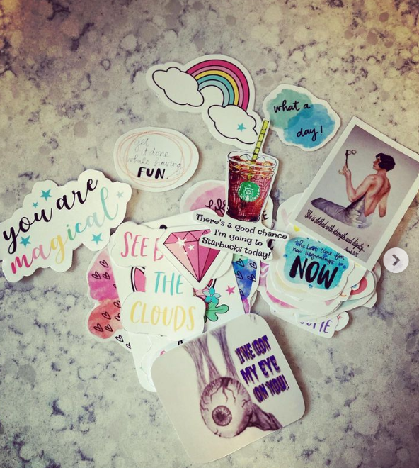 I printed these stickers using gloss sticker paper. The images of the eyeball, Pennywise, and woman were all drawn/painted by my niece. I took the images she designed and turned them into stickers. I have a variety of different prints. These stickers work well to dress up your water bottles, computers, or other personal items.