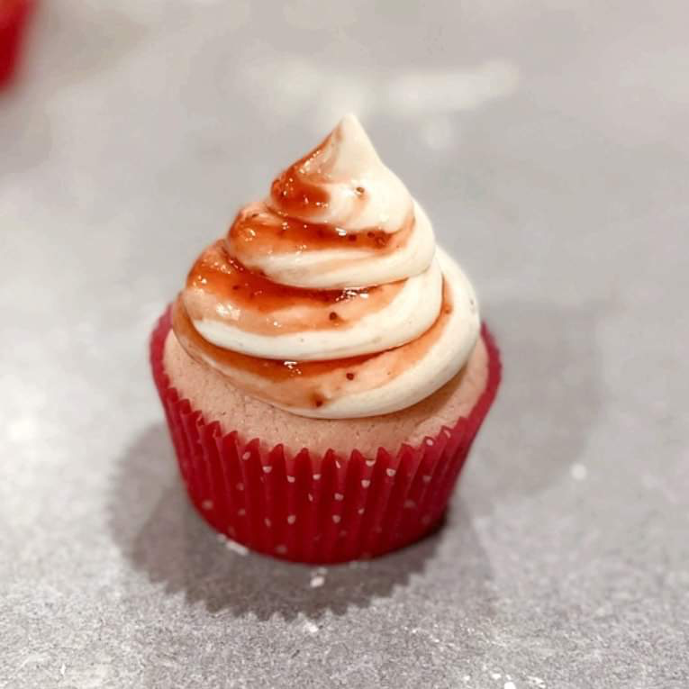 A strawberry flavored cake with a creme filling, topped with strawberry vanilla buttercream. This flavor can be ordered for a layer cake as well.