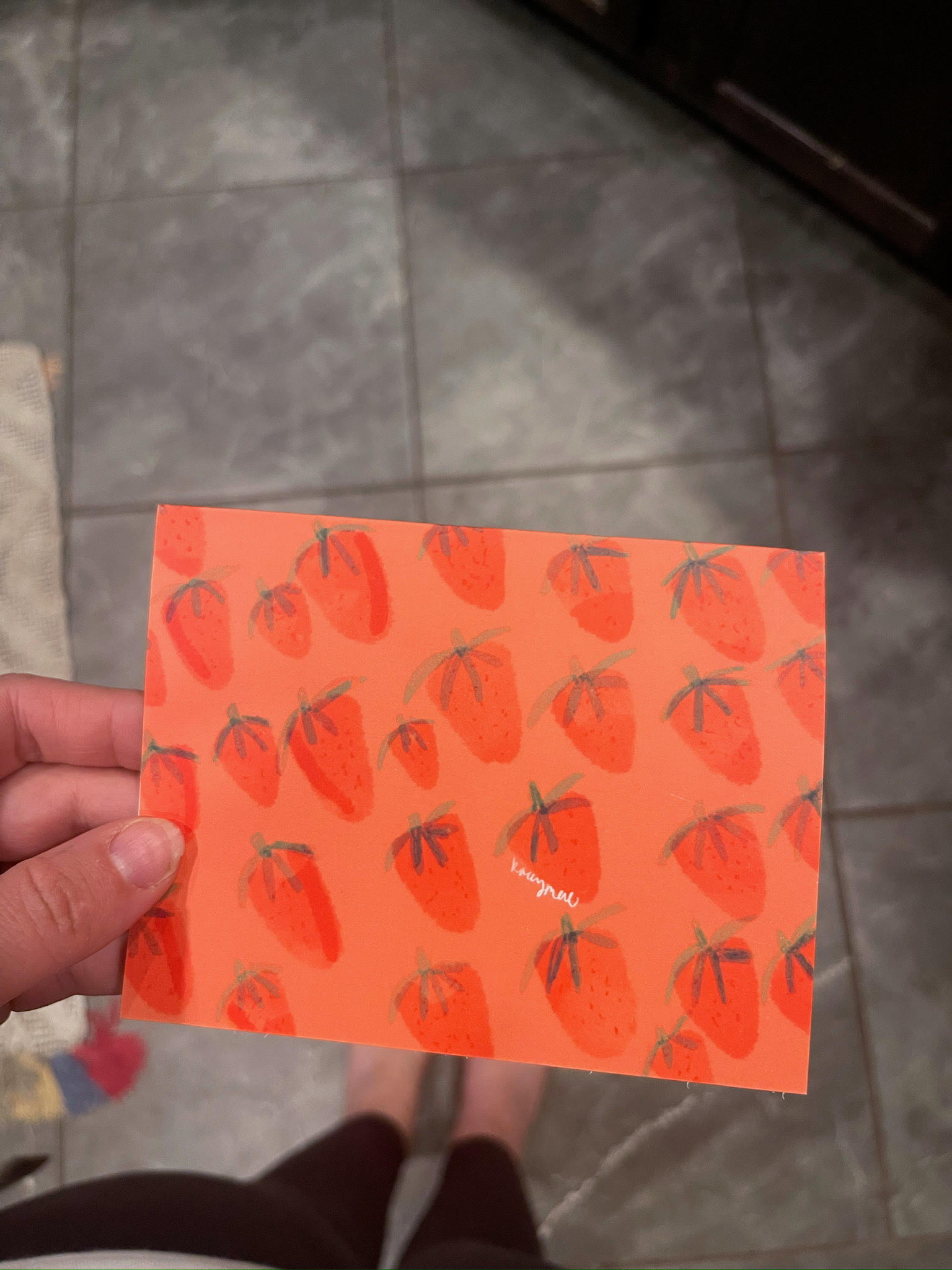 Write a hand-written note with these fun strawberry print cards. Each set includes 5 cards. Blank inside. White envelopes included.