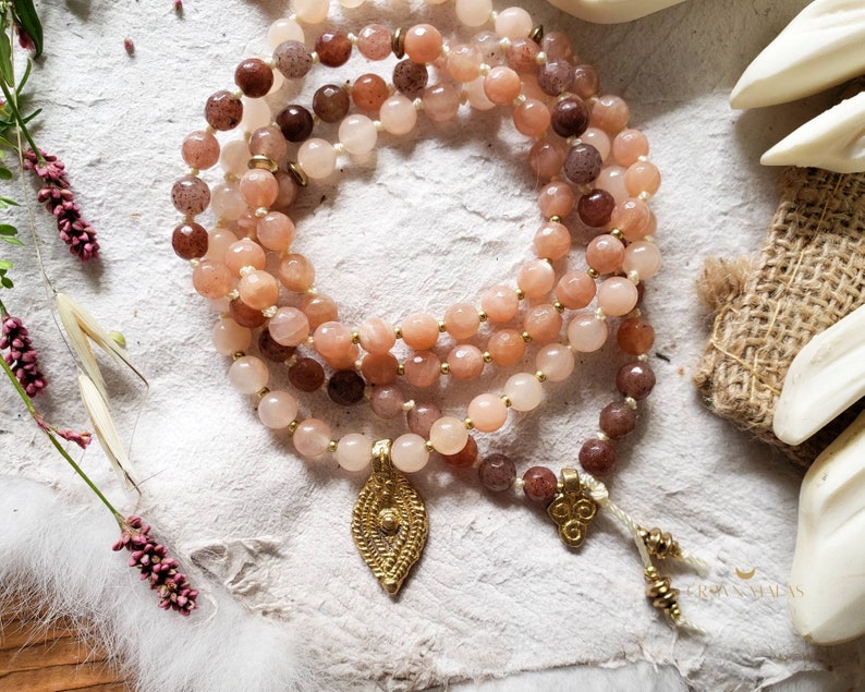 This gorgeous, warm, and inviting dainty 6mm full length mala (108 prayer beads) is set with the intention of unconditional love. Peach Chalcedony, Rosé Sunstone, and Red Leaf Aventurine combine for a flowing ombre color from light to dark tones.
