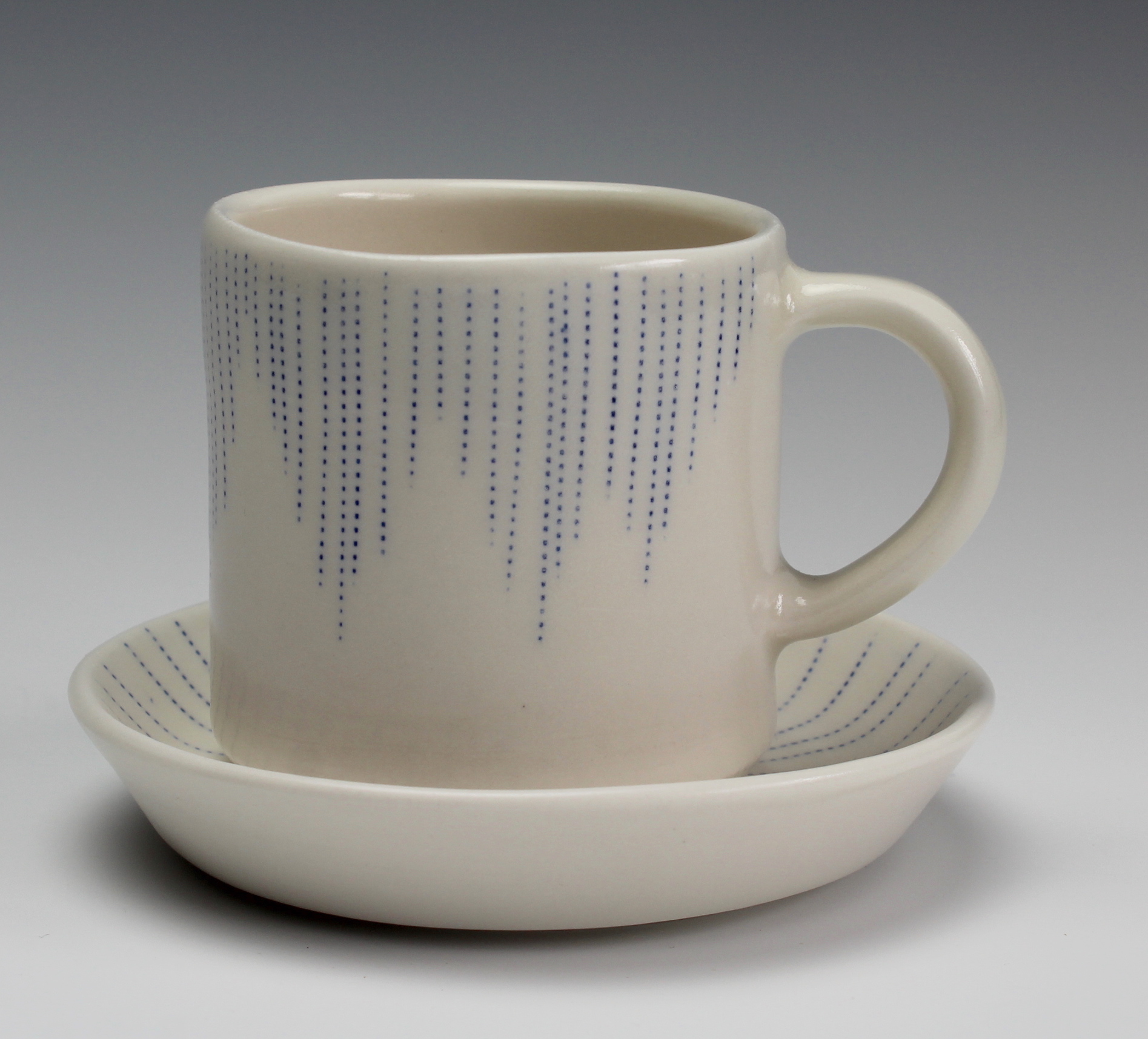 A little cup of tea really makes the world go round! This wheel thrown porcelain cup & saucer has been decorated with raining lines of tiny blue dots. The saucer is the perfect spot for the teabag or a sweet treat