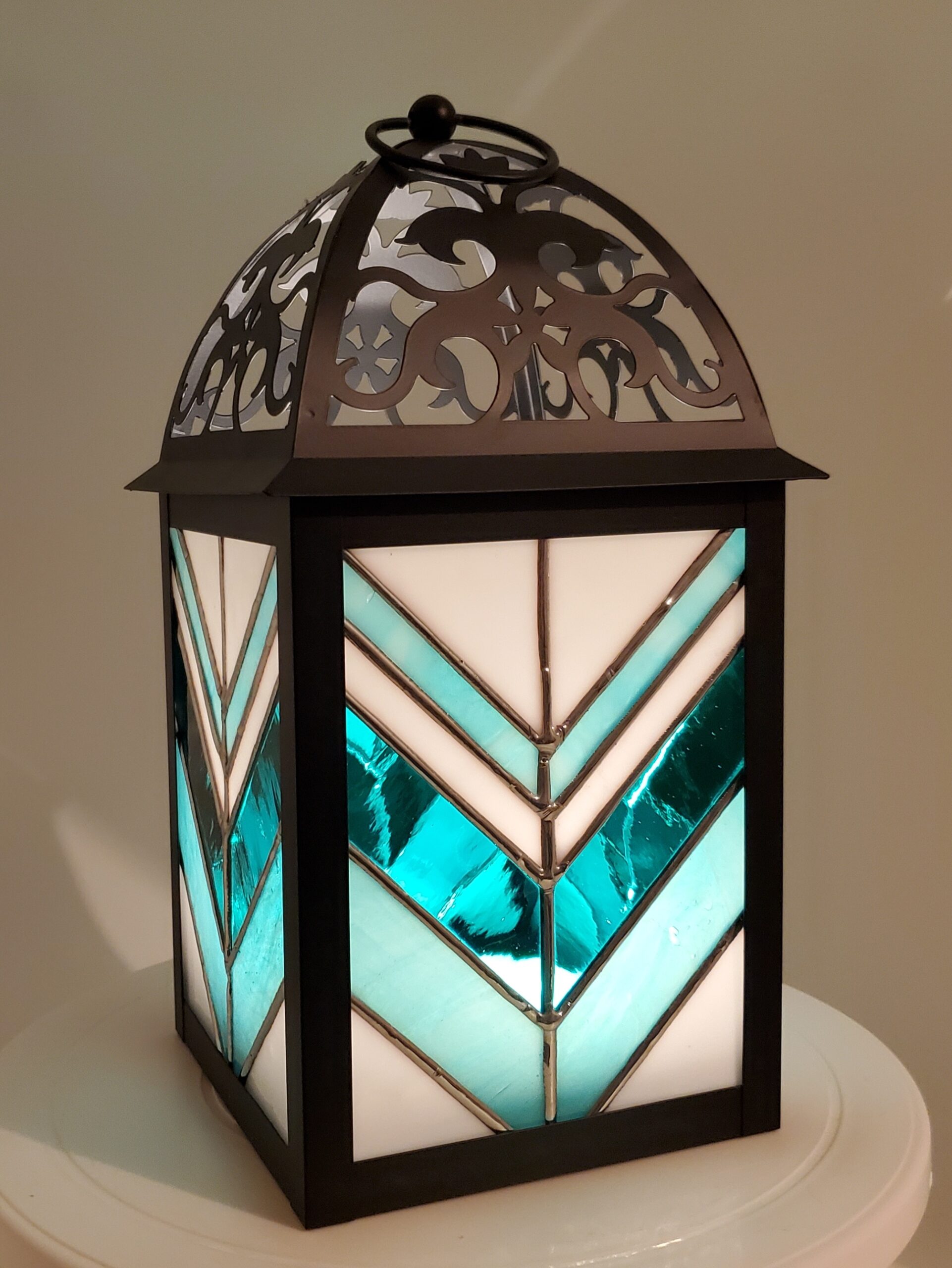 This teal lantern is one of a kind. It has 4 stained glass panels in it with a rechargeable, dimmable touch disk light. These lanterns are perfect for nightlights or mood lighting. I use mine on my tv stand for evening relaxing time. No sun or windows is needed for these beautiful pieces.