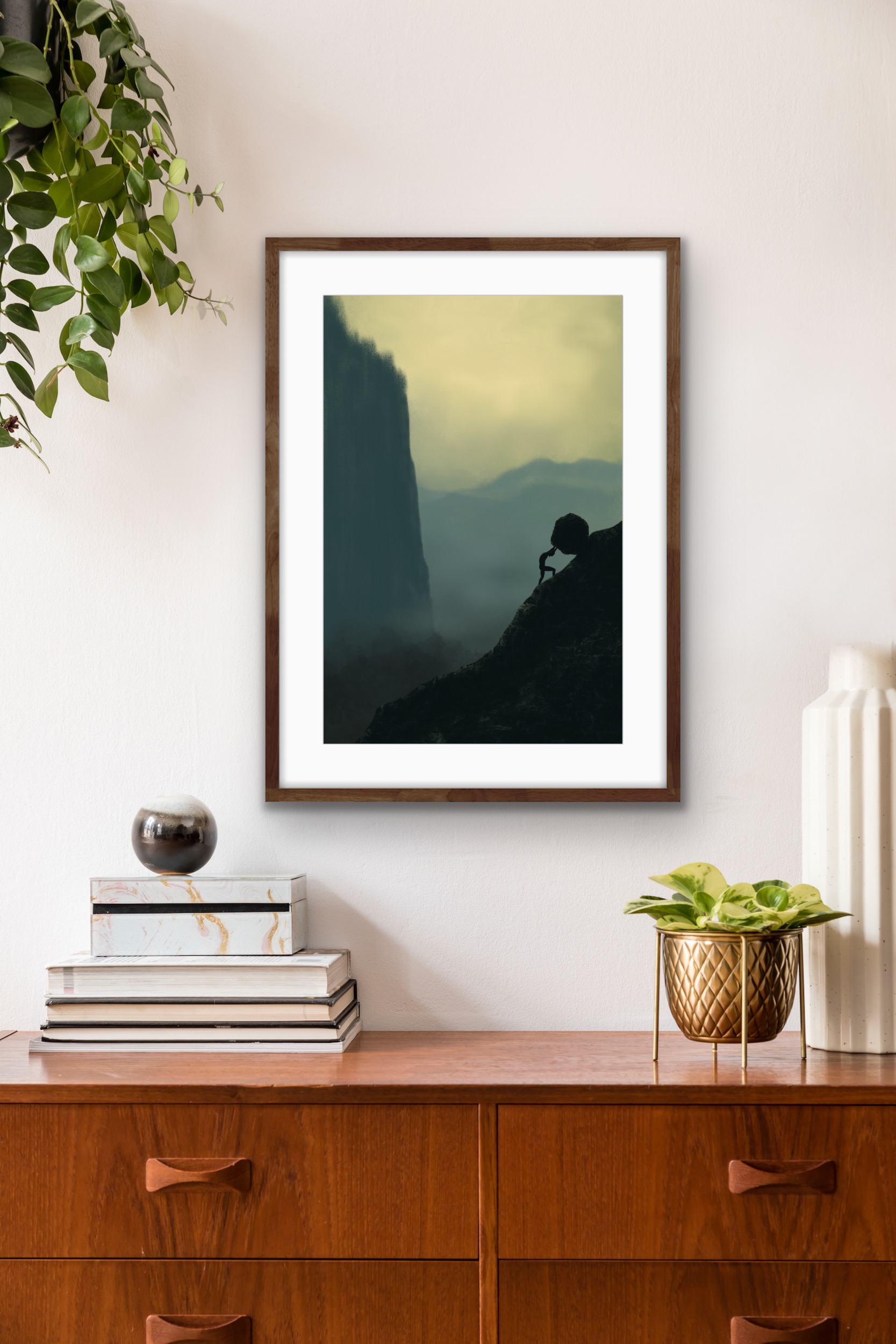 The Task is based on the tale of Sisyphus and depicts a lone figure struggling to push a massive boulder up a steep mountain, knowing that every time he finally reaches the top, the boulder will tumble and thunder back to the bottom. He must do this over and over again, destined to repeat the task for eternity. Hand-drawn digital art. Prints available in 20 x 30, 8 x 10, and 5 x 7.