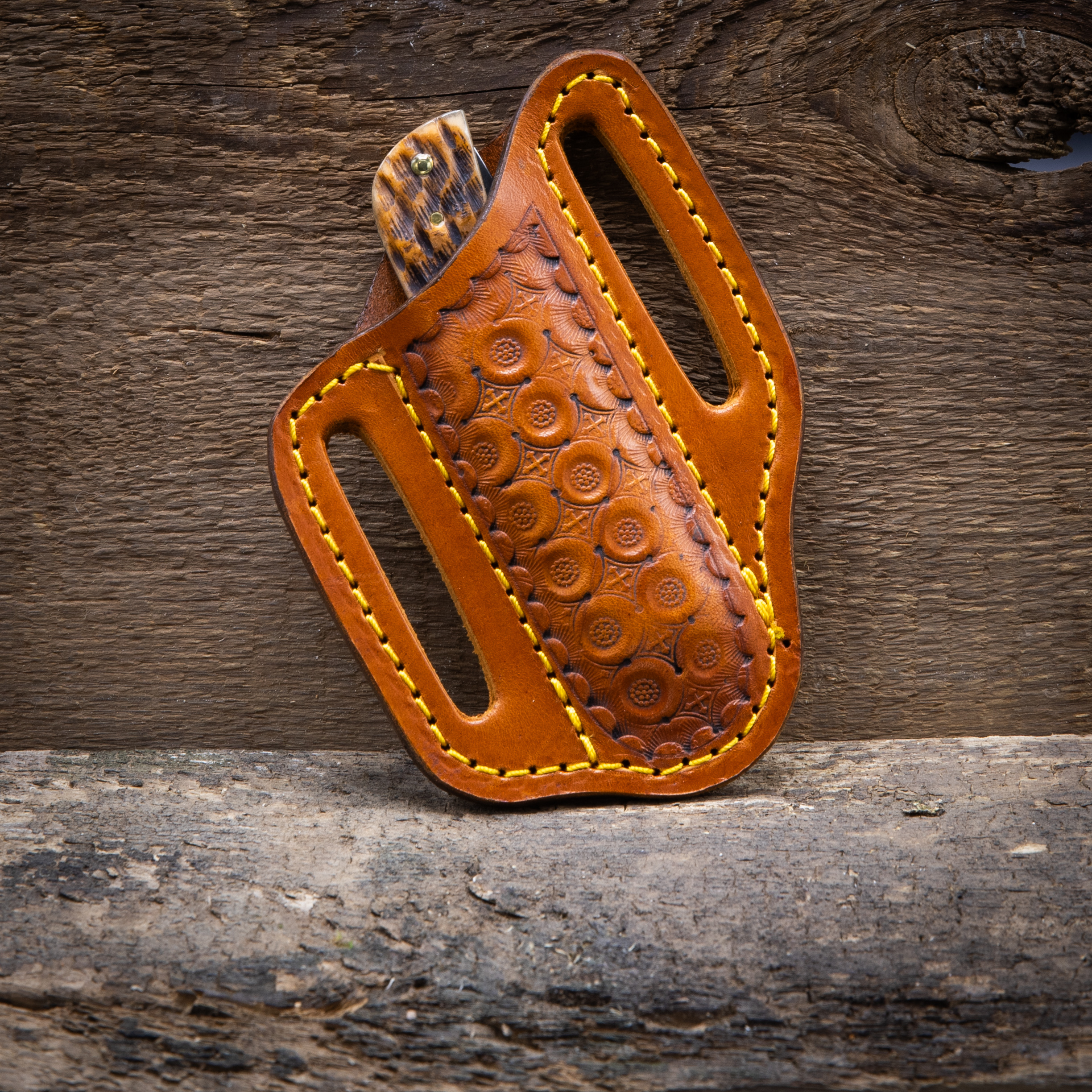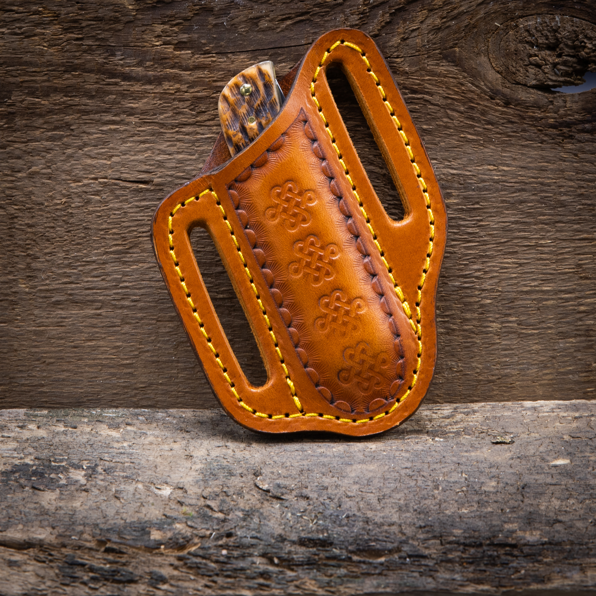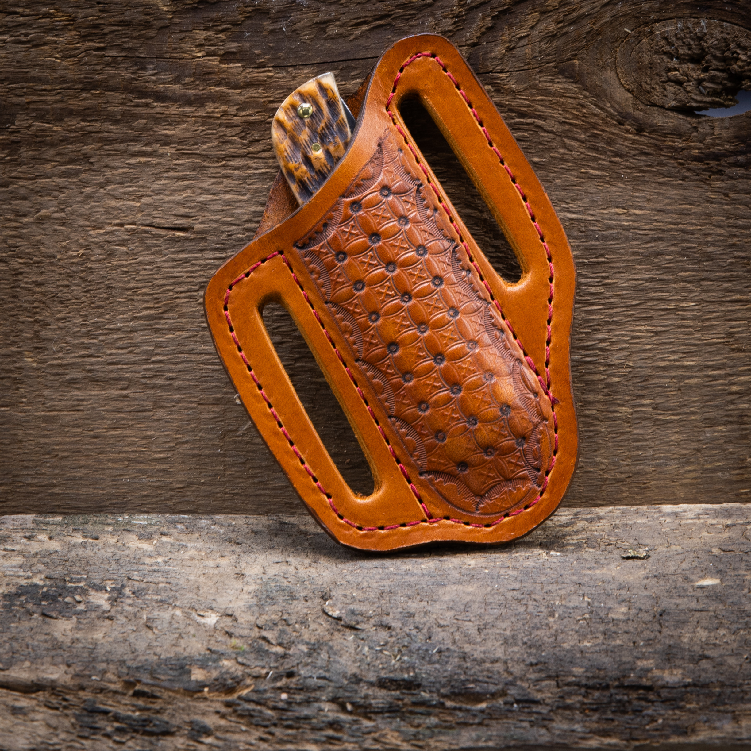 Knife sheath with tooled design. This sheath is sized to fit a common knife size like the Case Trapper or Old Timer single or double blade pocket knife.