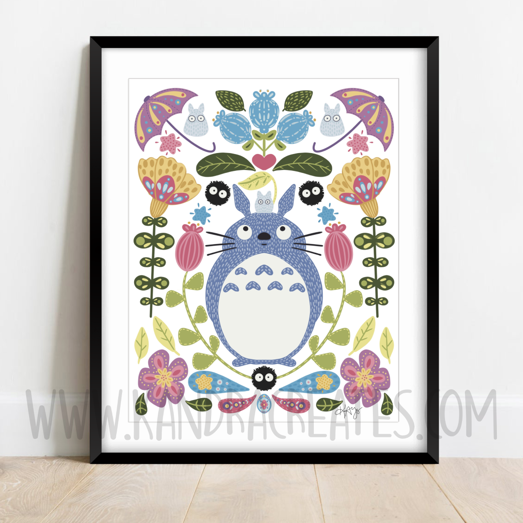 I love so many of Studio Ghibli’s films, but My Neighbor Totoro will always hold a special place in my heart. This fan art is inspired by this film and features dust sprites and Totoro, as well as his little chibi friends in a modern folk art style.