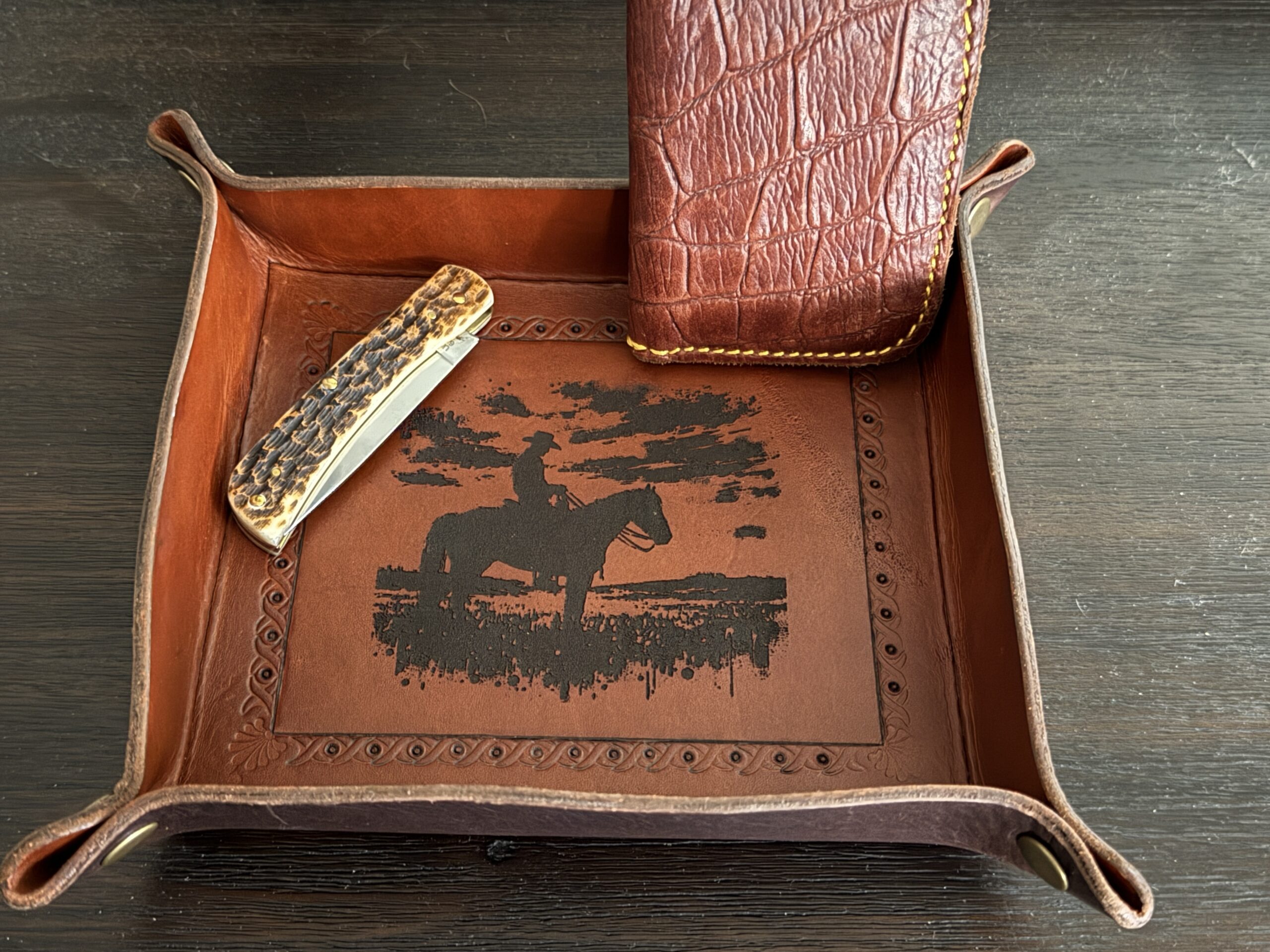Leather valet tray. This item can be custom made using a variety of leather. It can also be laser engraved with a design to suit your style or interests.