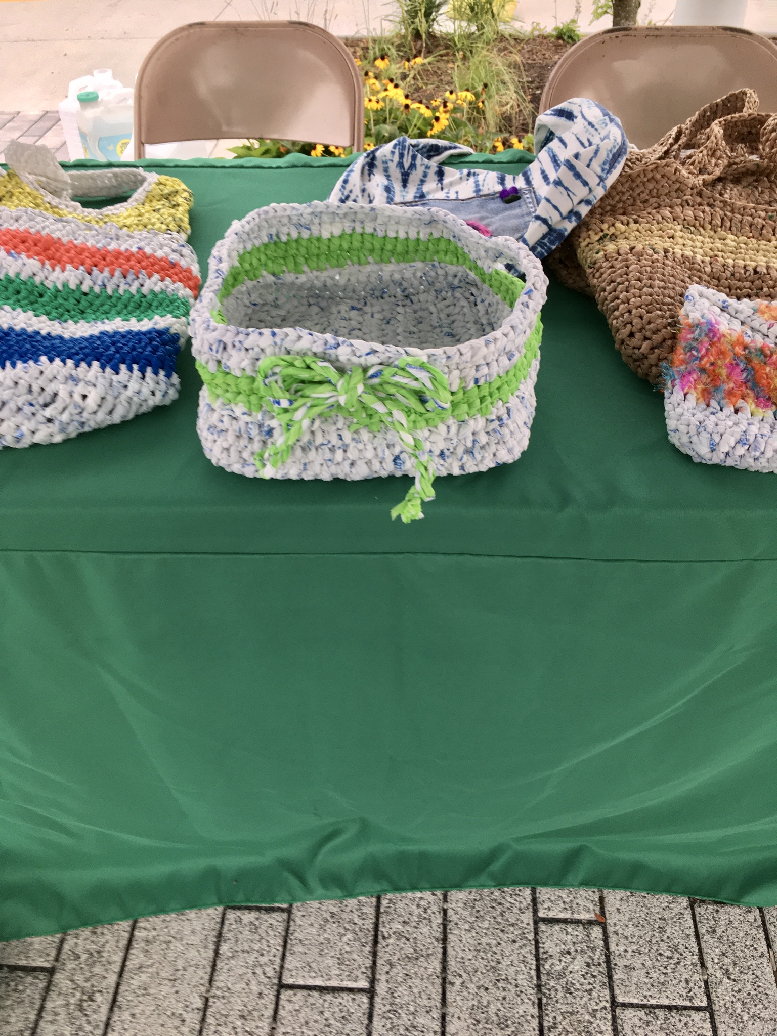 Made with Walmart bags and lime green accents. Approximately 10x10x6. Our baskets are made with double width loops to provide strength and structure. $30.00